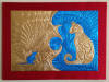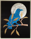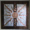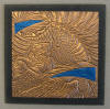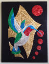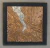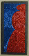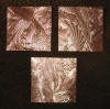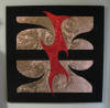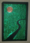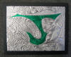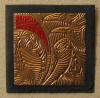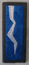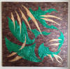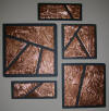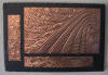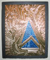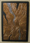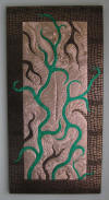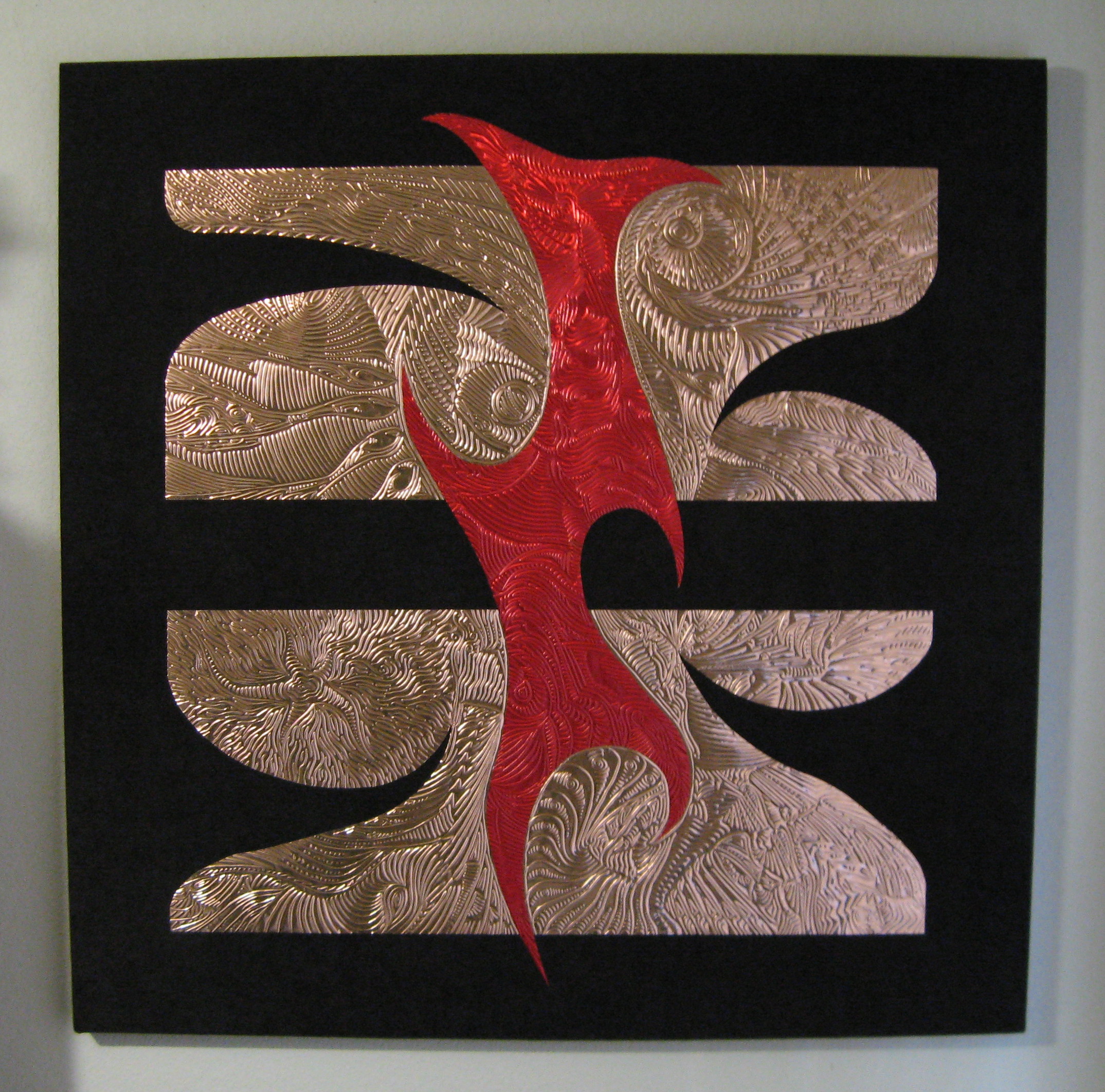 drawn completely freehand into thick copper or anodized aluminum foils, often with cutouts or different colored inserts.